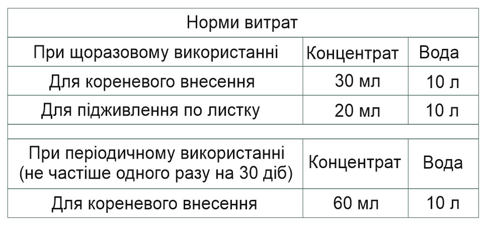 - Регулярність: при кожному поливі або один раз на 30 діб за умови дотримання рекомендованої концентраціі в готовому розчині.