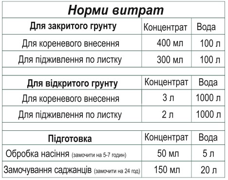 • Позакореневе підживлення: розпилювати на листя для швидкого засвоєння.